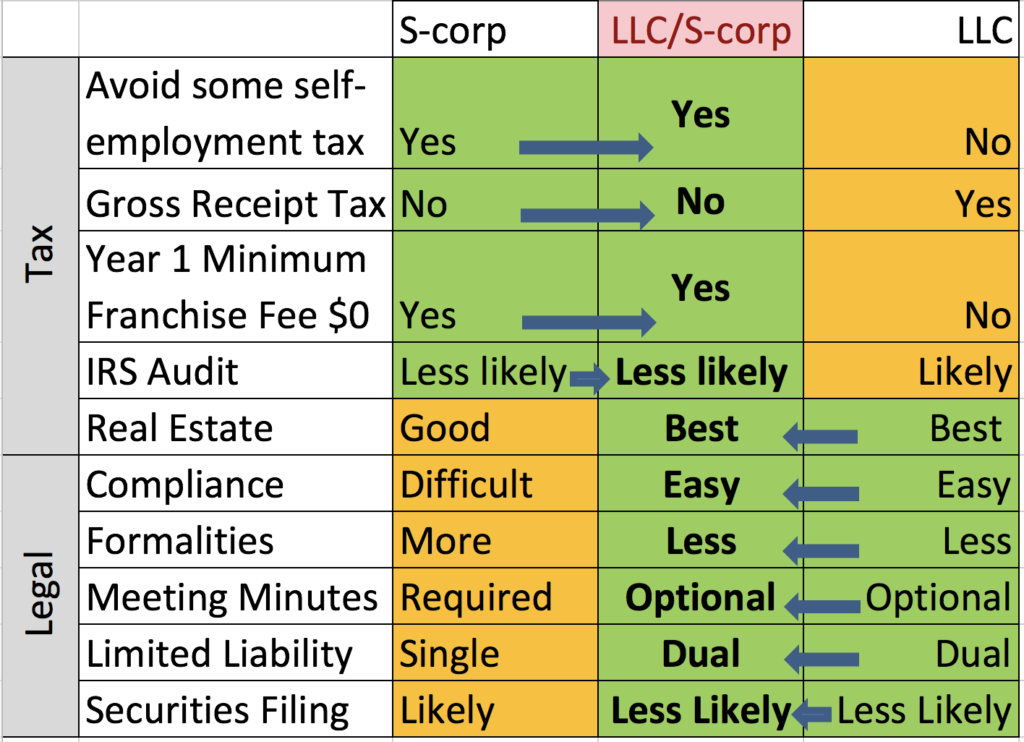 With the LLC/S-corp, you get to allocate income between distributions and salary, thus lowering your self-employment tax liability. Also, the LLC/S-corp is not subject to gross receipt tax for gross sales in excess of $250,000. Furthermore, in the first year of business, you get to avoid the $800 minimum franchise tax which for many small businesses might provide an additional benefit if no or little profit is expected during the first year of business. As far as using this entity for real estate purposes, whether it’s to hold, flip, or transfer property, this entity is ideal; please review my article on real estate entities for a detailed discussion. Lastly, while you can never completely audit-proof your business’s income tax return, based on recent statistics[1] the IRS is ten times less likely to audit an S-corp as opposed to an LLC filing Schedule C. Notably, third-parties making payments to an S-corp are not required to file form 1099-MISC or report to the IRS.